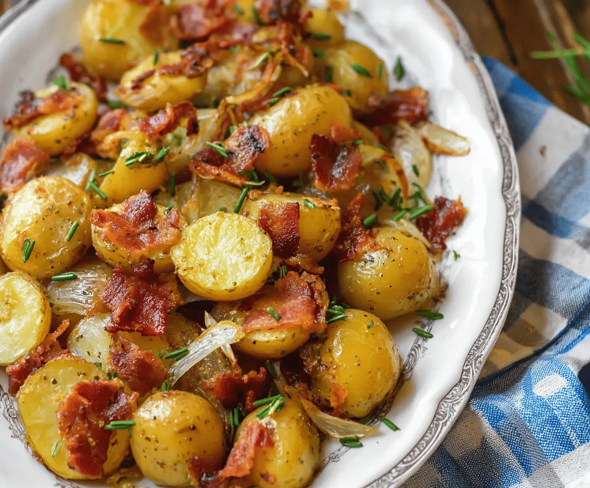 Enjoy this hearty and flavorful dish featuring tender baby potatoes, savory onions, and crispy bacon!
