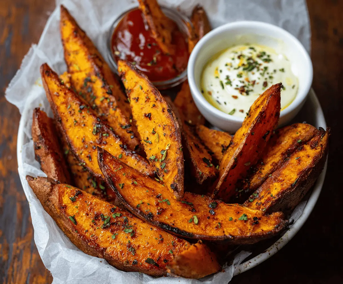 Enjoy your delicious, healthy baked sweet potato wedges with a fresh herb garnish and a creamy dip—they’re sure to be a hit!