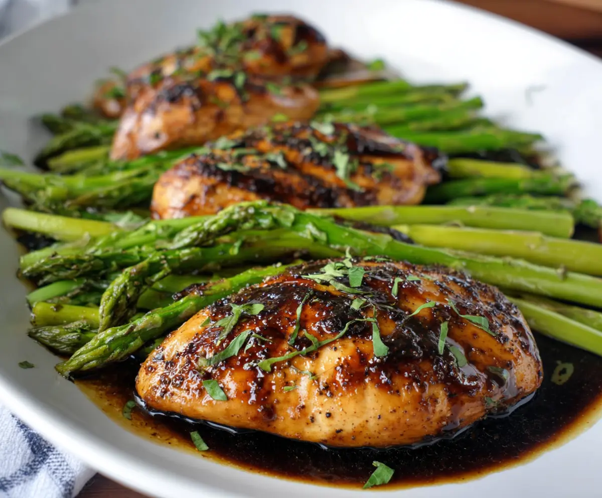 Carefully plate the chicken and asparagus, spooning any remaining balsamic glaze over the top. Finish by garnishing with freshly chopped parsley for a burst of color and flavor. Enjoy your delightful balsamic chicken with asparagus!