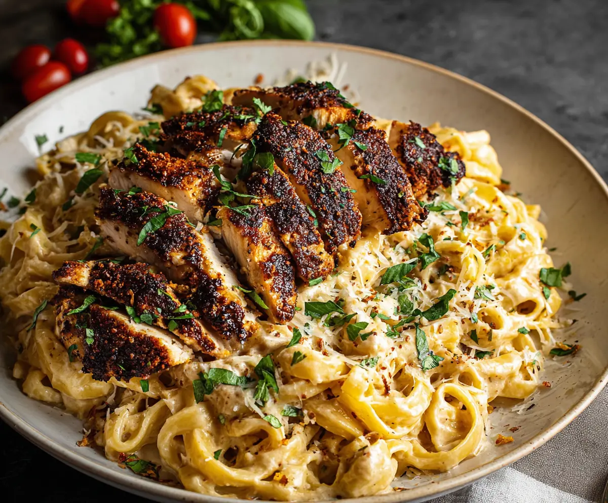 Slice the rested blackened chicken into strips and lay it over the pasta. Finally, garnish with freshly chopped parsley or dill for a touch of color and added flavor.