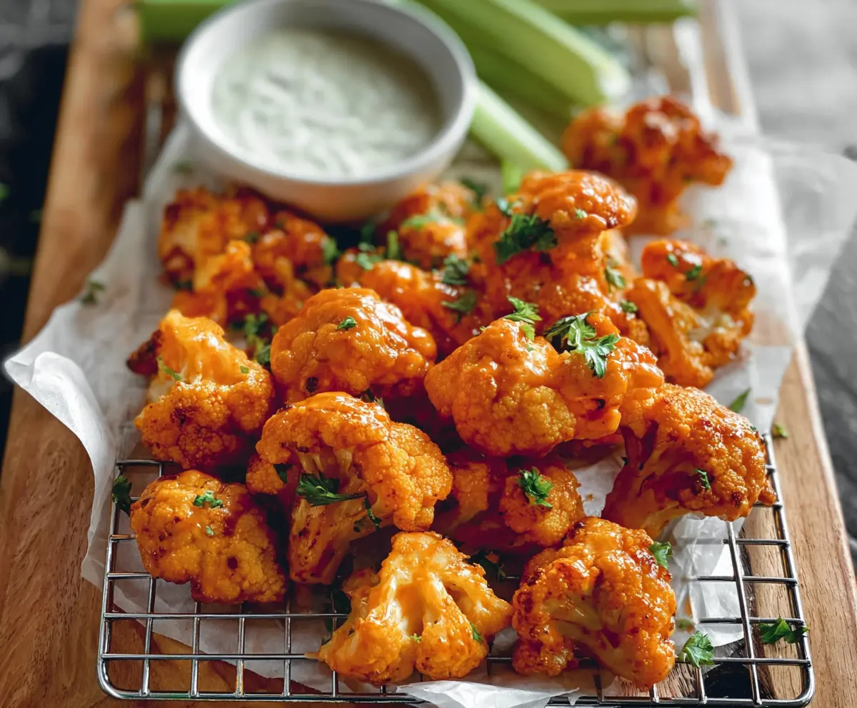 These Buffalo Cauliflower Wings are spicy, crispy, and a perfect snack for any party! The cauliflower gets coated in a tasty Buffalo sauce, making them super flavorful.