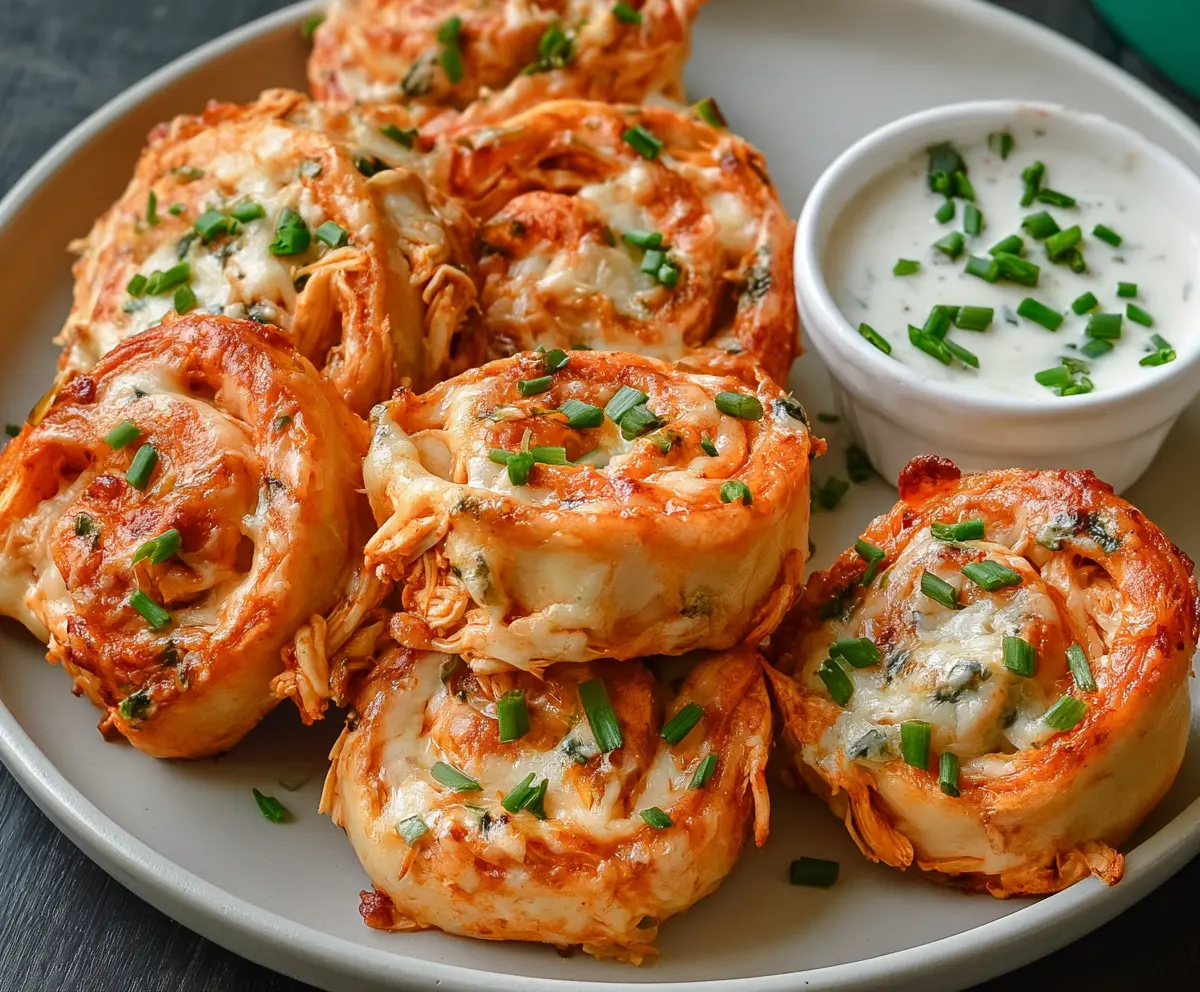 Serve these warm with ranch or blue cheese dressing on the side and optional celery sticks for dipping. Enjoy your zesty Buffalo Chicken Ranch Pinwheels!