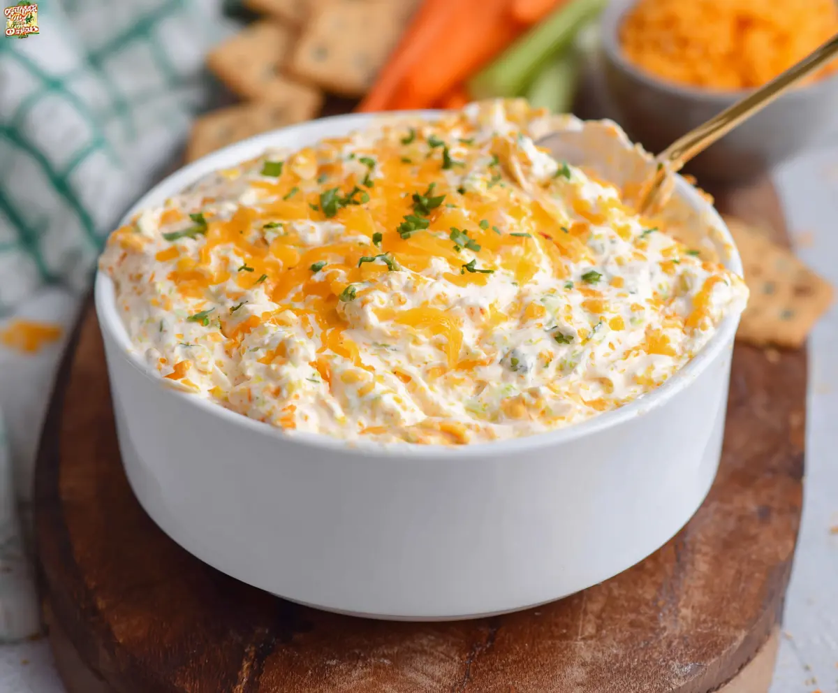 Take your dip and transfer it to a nice serving bowl. If you want to make it look even more appetizing, sprinkle some extra cheddar cheese and parsley on top for garnish!
