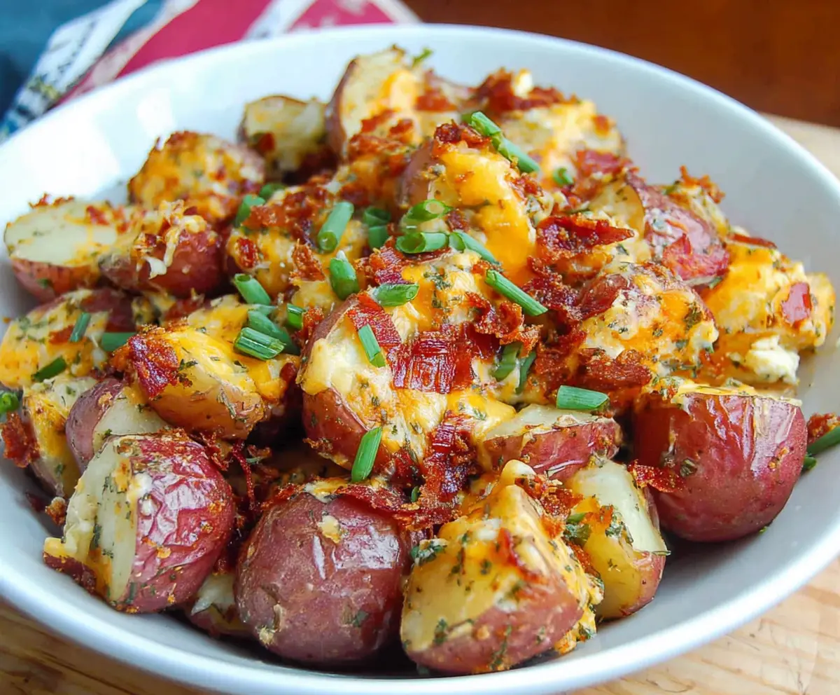 This recipe yields crispy, buttery, cheesy red potatoes with a touch of garlic and bacon flavor, topped with fresh herbs for an appetizing finish. Bon appétit!