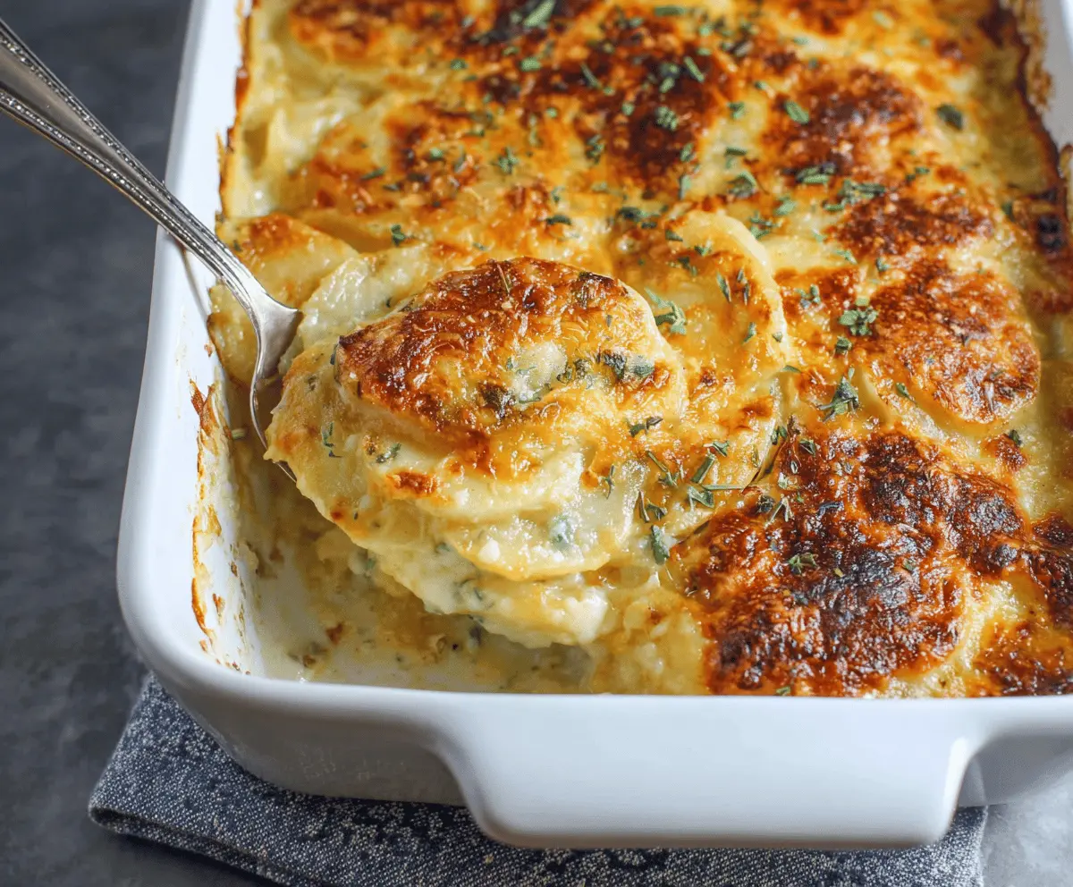 When ready, take the scalloped potatoes out and let them rest for about 5-10 minutes. This helps the layers set a bit more. If you’re feeling fancy, garnish with fresh thyme leaves.