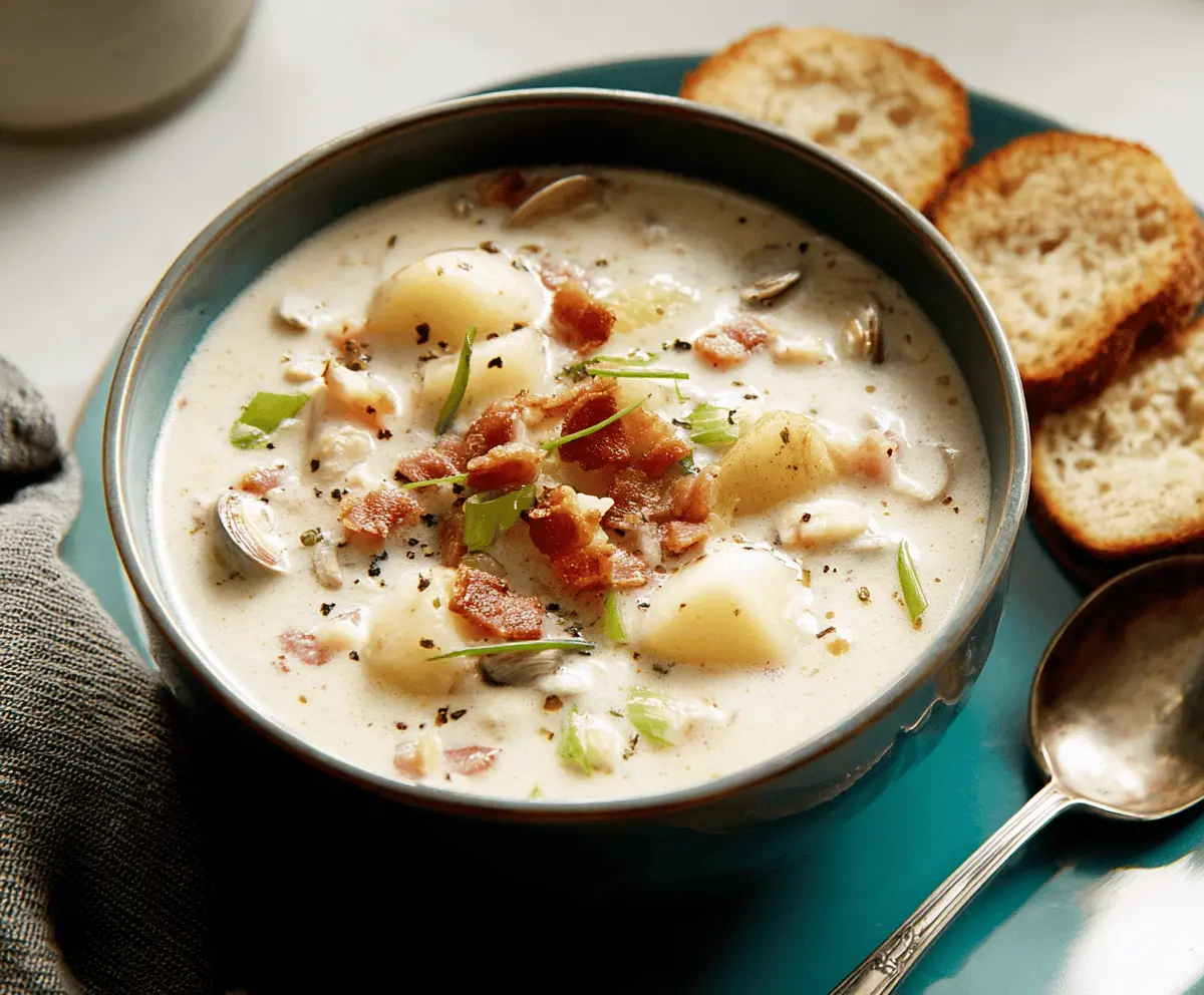 This clam chowder is a warm, creamy soup filled with tender clams and potatoes. It’s like a cozy hug in a bowl on chilly days!
