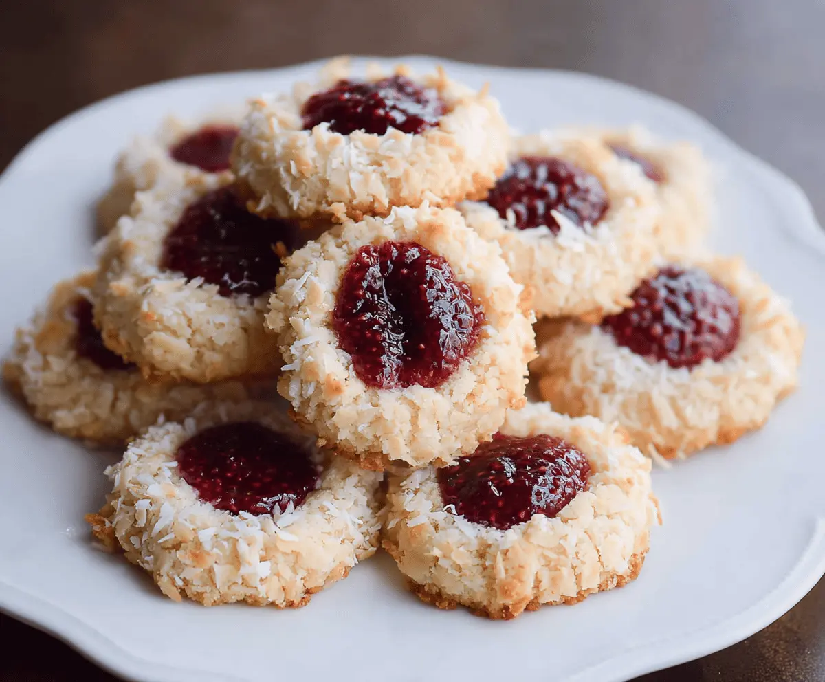 These Coconut Raspberry Thumbprint Cookies are sweet little treats, packed with coconut flavor and a burst of raspberry in the middle. They’re soft, chewy, and perfect for any occasion!