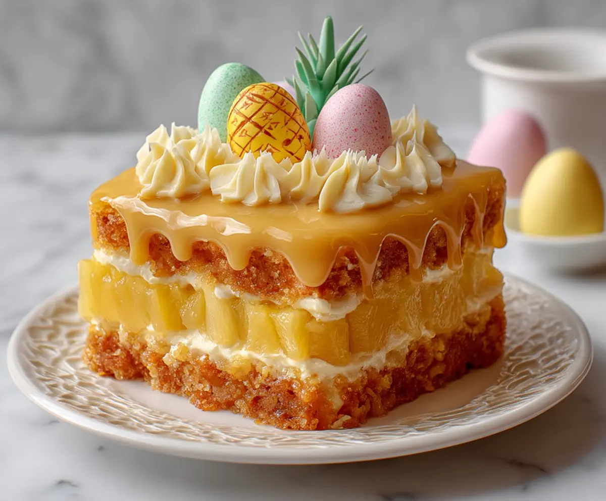 This Easter Pineapple Heaven Cake is not just beautiful but also combines moist vanilla layers, creamy pineapple filling, and a glossy pineapple glaze, making it a delicious centerpiece for your festive occasion!