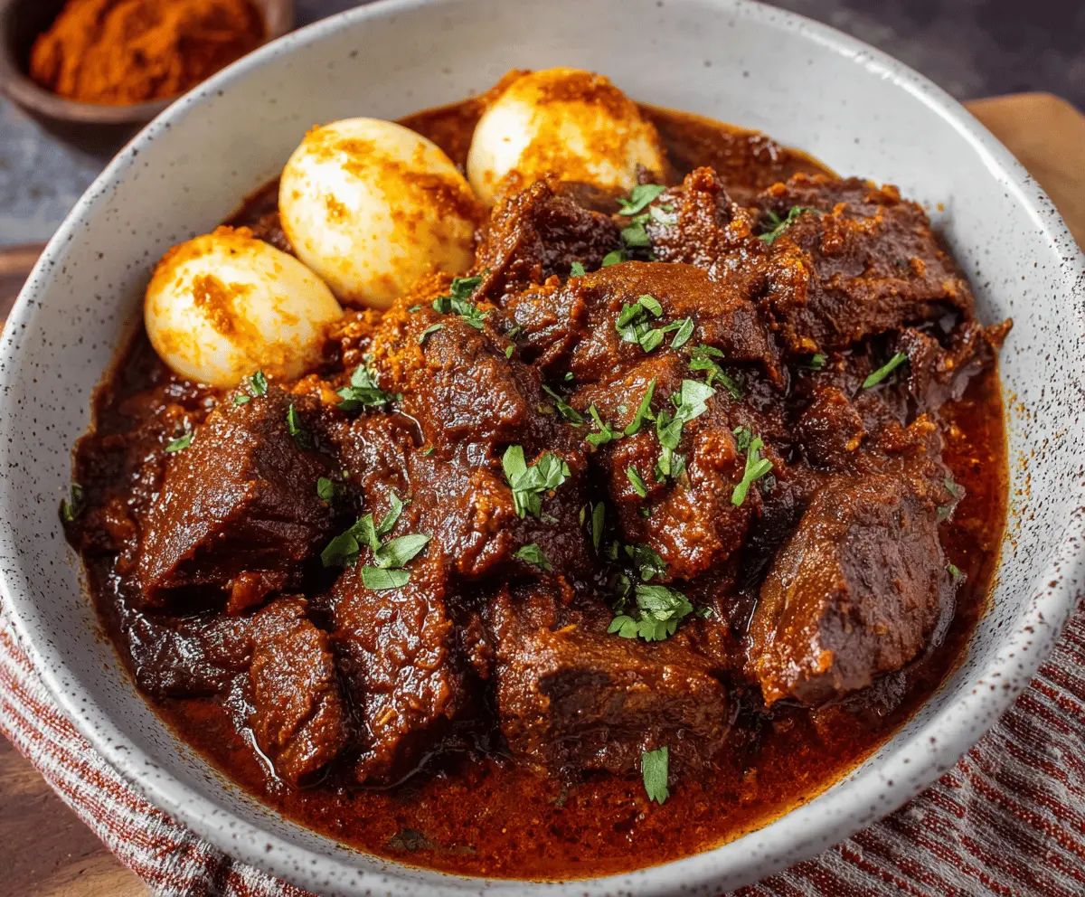 Enjoy this rich and flavorful Ethiopian beef stew with tender meat and spiced eggs, perfect for a hearty meal!