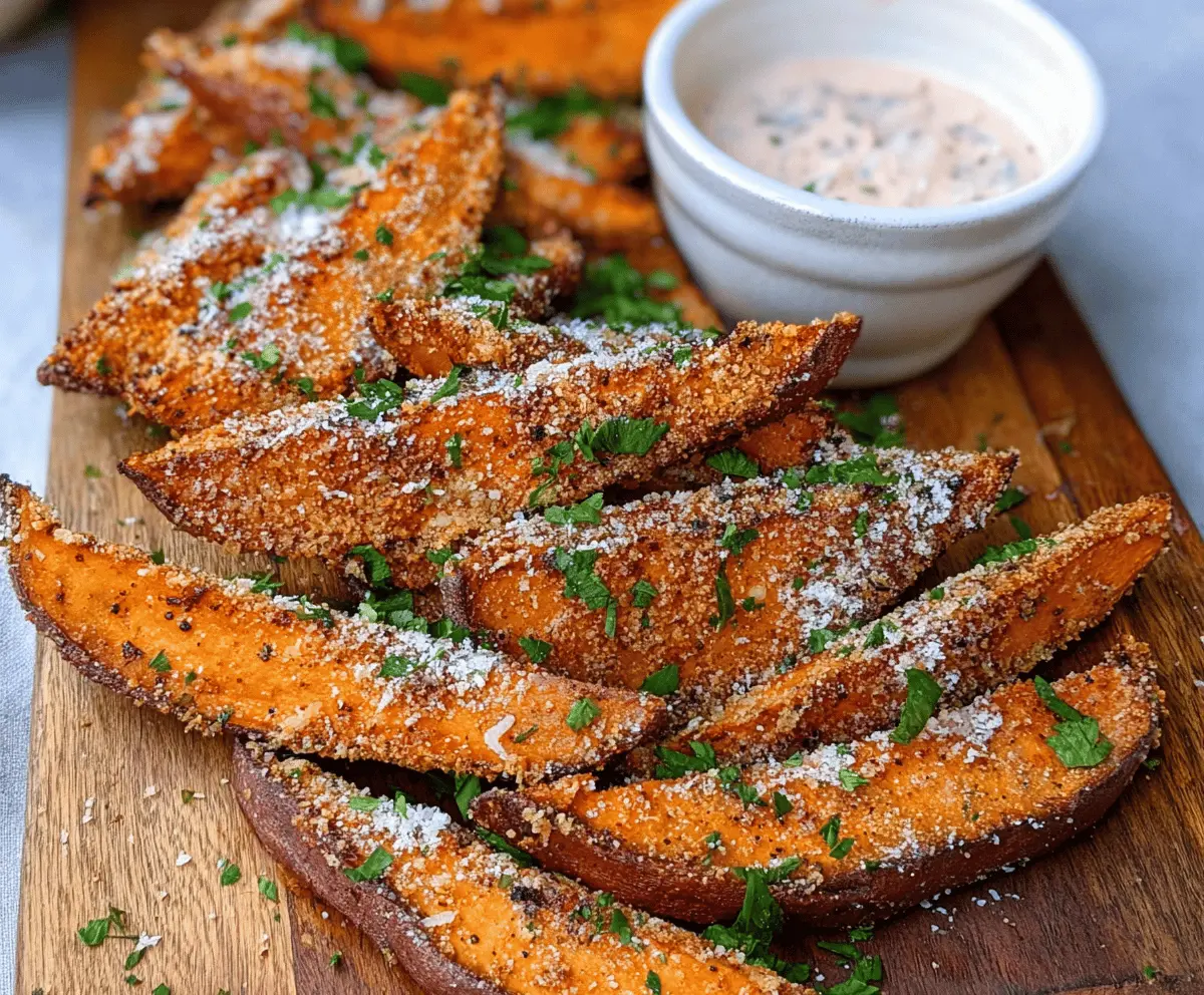 These Garlic Parmesan Sweet Potato Wedges are crispy, flavorful, and oh-so-yummy! Coated in garlic and Parmesan cheese, they make a perfect side dish or snack.