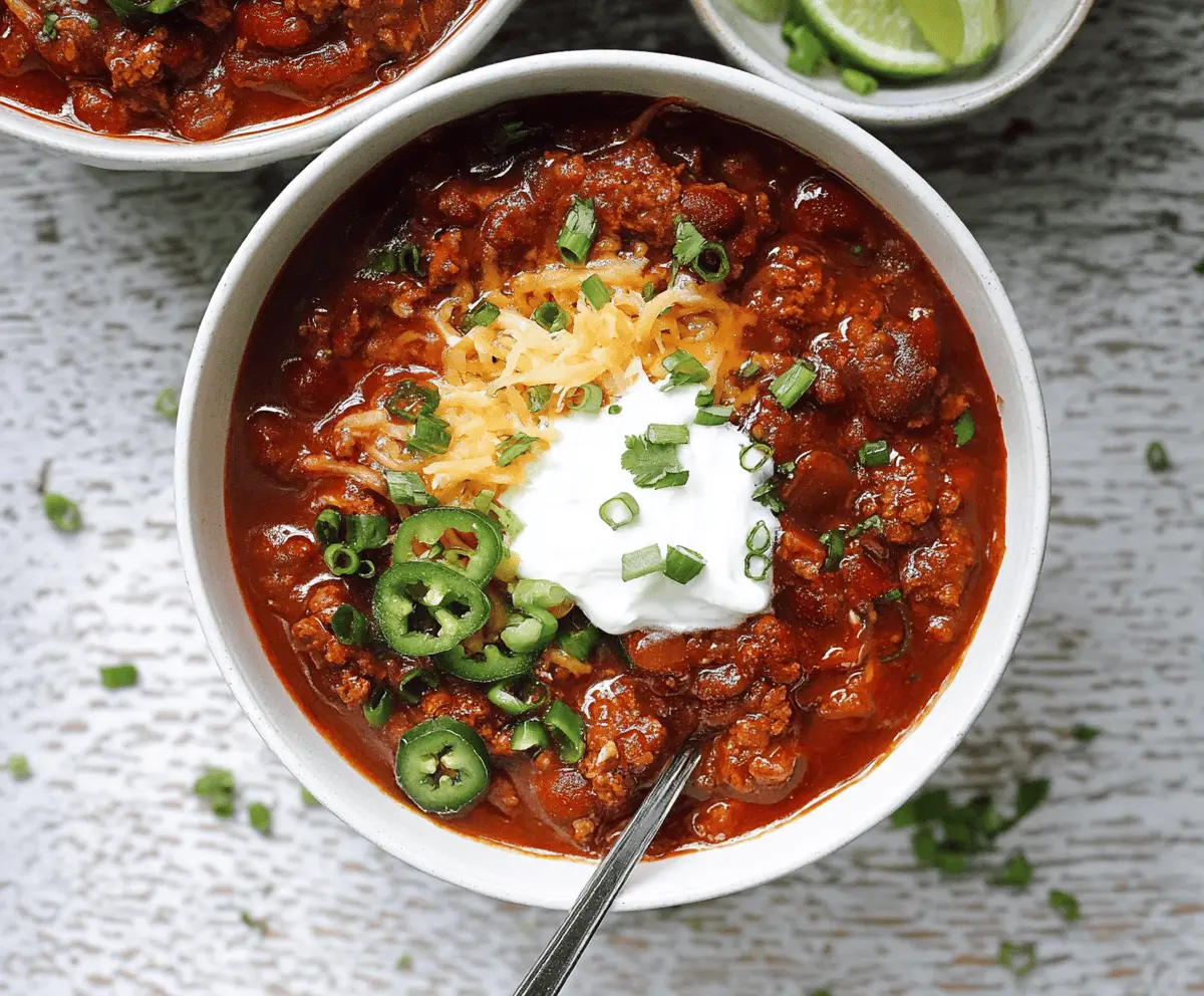 Serve the chili hot, garnished with your choice of tasty toppings like shredded cheddar cheese, a dollop of sour cream, sliced jalapeños, fresh cilantro, or lime wedges for a nice zing!