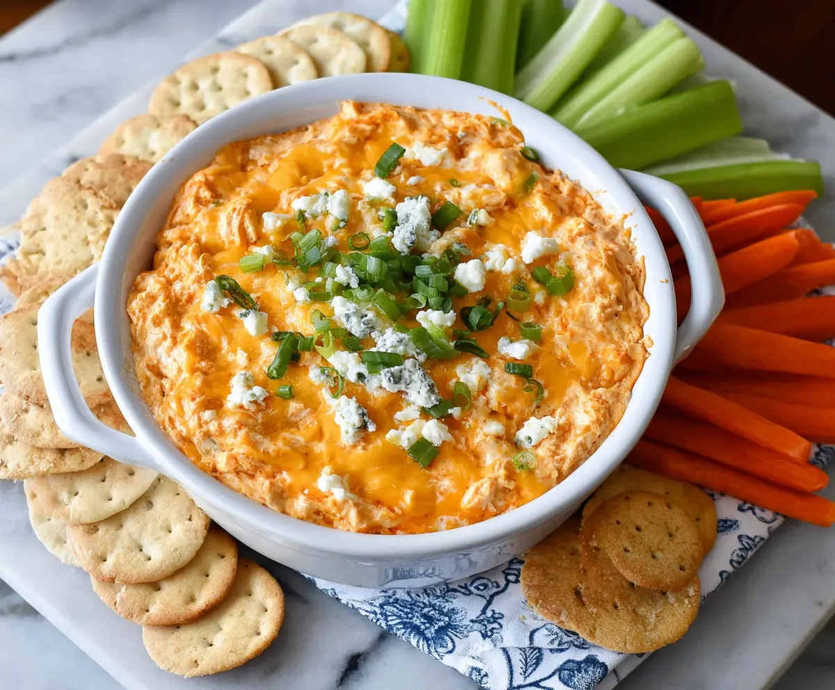 Serve your warm Greek Yogurt Buffalo Chicken Dip with crunchy celery sticks, carrot sticks, and your favorite crackers. Dive in and enjoy every spicy, creamy bite!