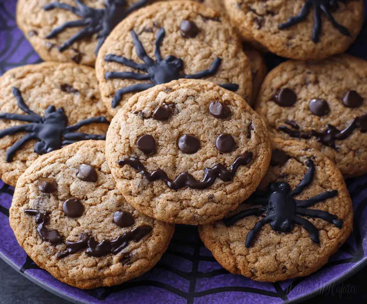 Enjoy your festive and delicious Halloween Chocolate Chip Cookies decorated with spooky spider designs!