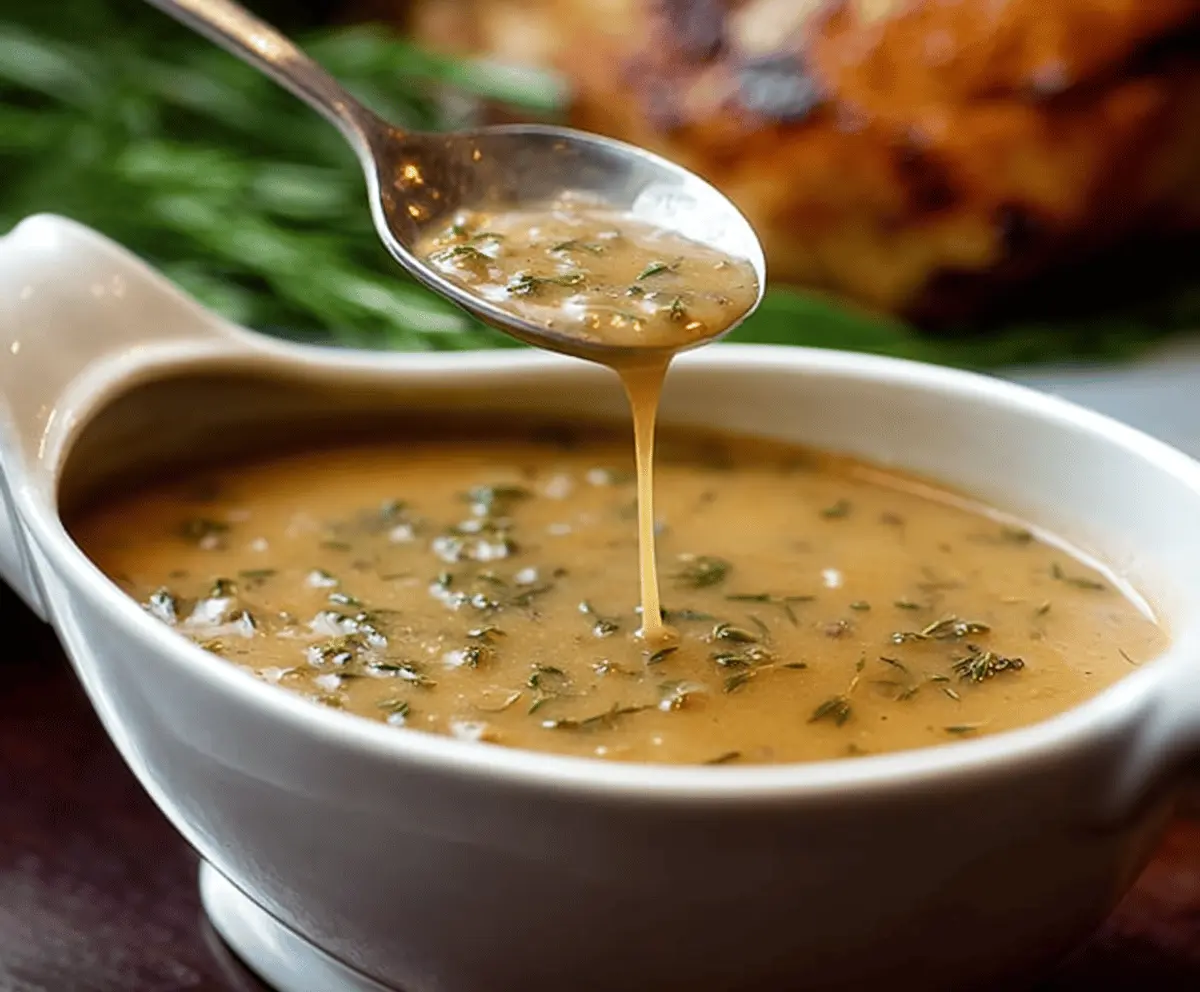 Your warm, herbed turkey gravy is now ready to serve! Ladle it generously over sliced turkey or mashed potatoes and enjoy every delicious bite!