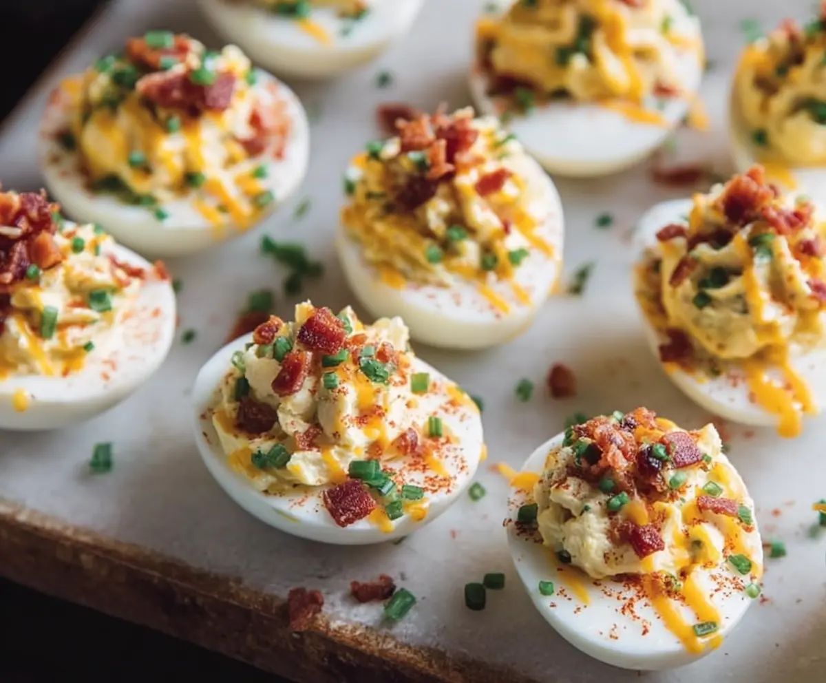 Enjoy your loaded deviled eggs as a flavorful appetizer or party snack!