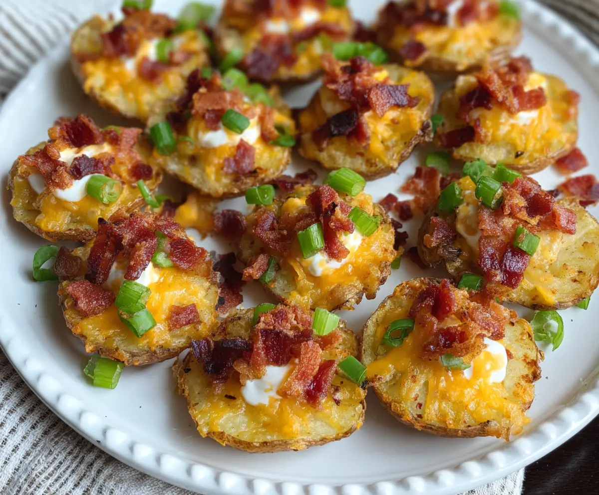 These Loaded Mini Potato Bites are small but mighty! With crispy potatoes topped with cheese, sour cream, and crispy bacon, they make a tasty snack for any gathering.
