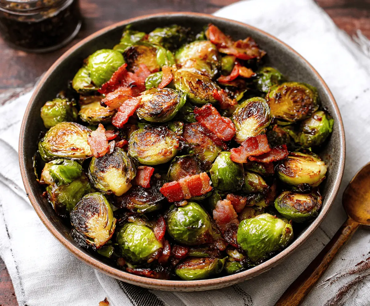 You can prepare the Brussels sprouts and cook the bacon in advance, but it’s best to combine everything shortly before serving. If you need to prepare ahead, reheat the Brussels sprouts gently on the stove, then add the bacon just before serving for the best texture and flavor.