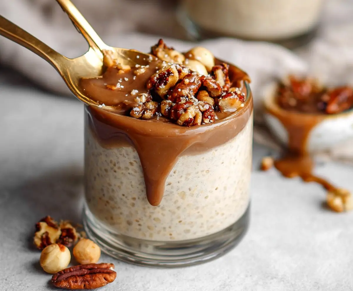 For an extra indulgent look, you can add cocoa nibs or dark chocolate shavings if desired. Serve your Maple Praline Overnight Oats chilled and enjoy the deliciously creamy and crunchy breakfast!
