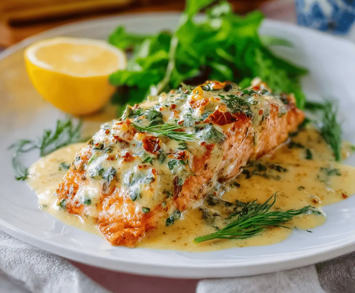 Enjoy this rich, flavorful salmon dish that is creamy, garlicky, and packed with fresh herbs—perfect to impress at any dinner!