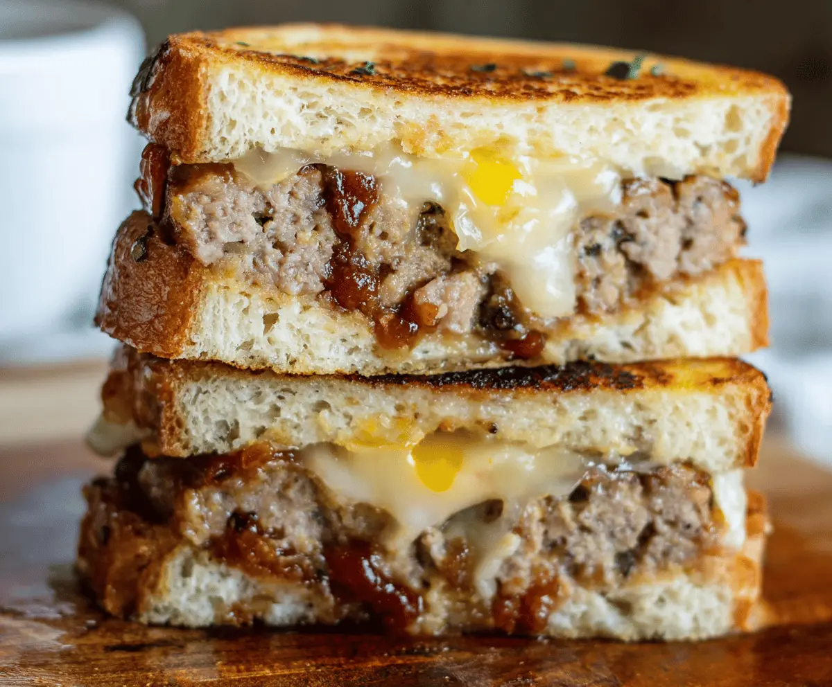 Remove the sandwiches from the skillet, slice them in half, and serve warm. Enjoy the savory, juicy meatloaf combined with melted cheese and tangy sauce nestled between crispy toasted bread—an ultimate comfort sandwich ready to delight your taste buds!