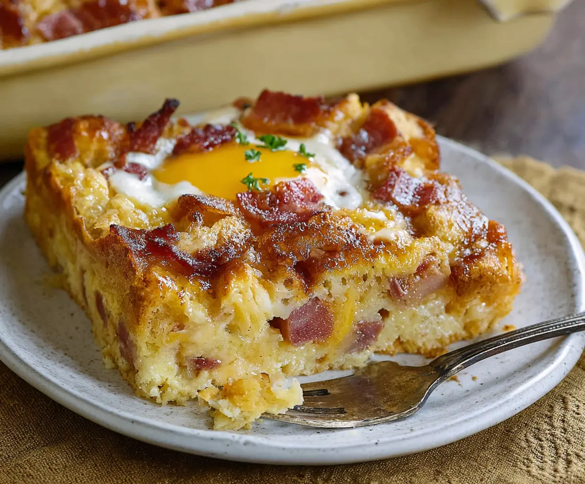 This Monte Cristo Breakfast Casserole is a warm, tasty dish that combines eggs, ham, and cheese, all layered together with sweet bread. It’s like a breakfast sandwich turned into a cozy casserole!