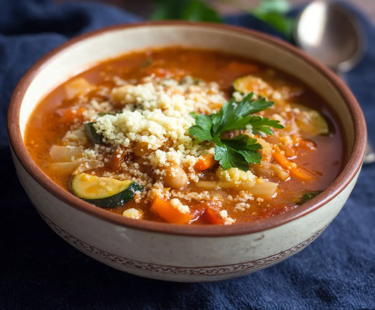 This Moroccan-spiced vegetable soup is a warm hug in a bowl! Loaded with colorful veggies and fluffy couscous, it’s both hearty and comforting. The spices really liven it up!