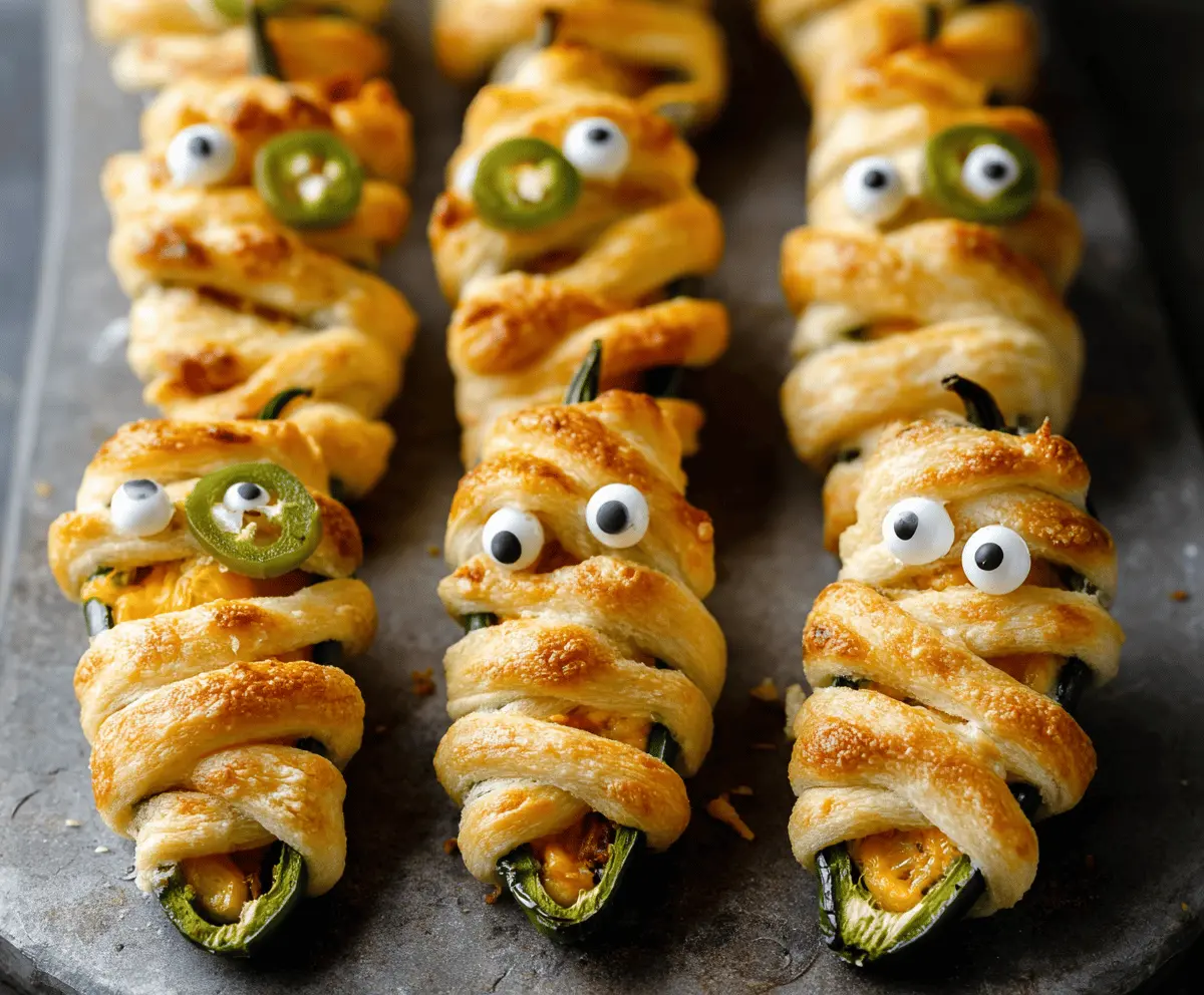 Mummy Jalapeño Poppers are a fun twist on a classic snack! They’re spicy jalapeños stuffed with cream cheese and wrapped in a flaky pastry that looks like a cute mummy.