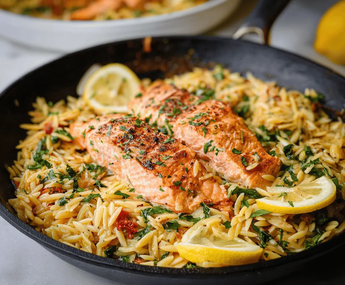Nestle the seared salmon fillets back on top of the orzo. Cover the skillet once more, and let it cook for an additional 3-5 minutes, or until the salmon is cooked through and flakes easily with a fork.