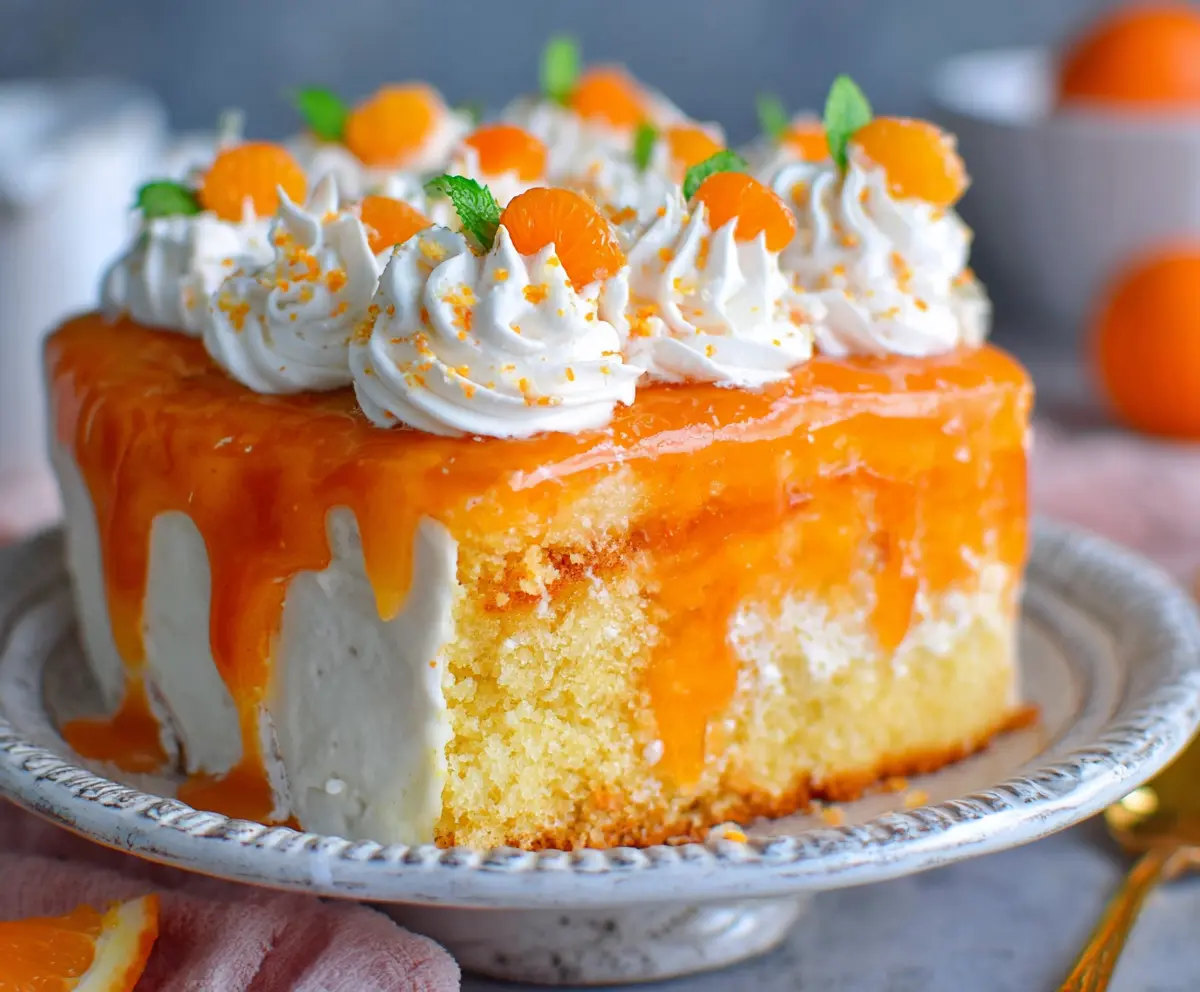 When the cake is completely set, it’s time to make it pretty! Pipe whipped cream on top of the glaze in rosettes or dollops. Add fresh orange segments (mandarin or clementine) on top of each whipped cream swirl. For a bit of crunch, sprinkle crumbled orange cookies along the sides of the cake, and if you like, garnish with a fresh mint leaf on top.