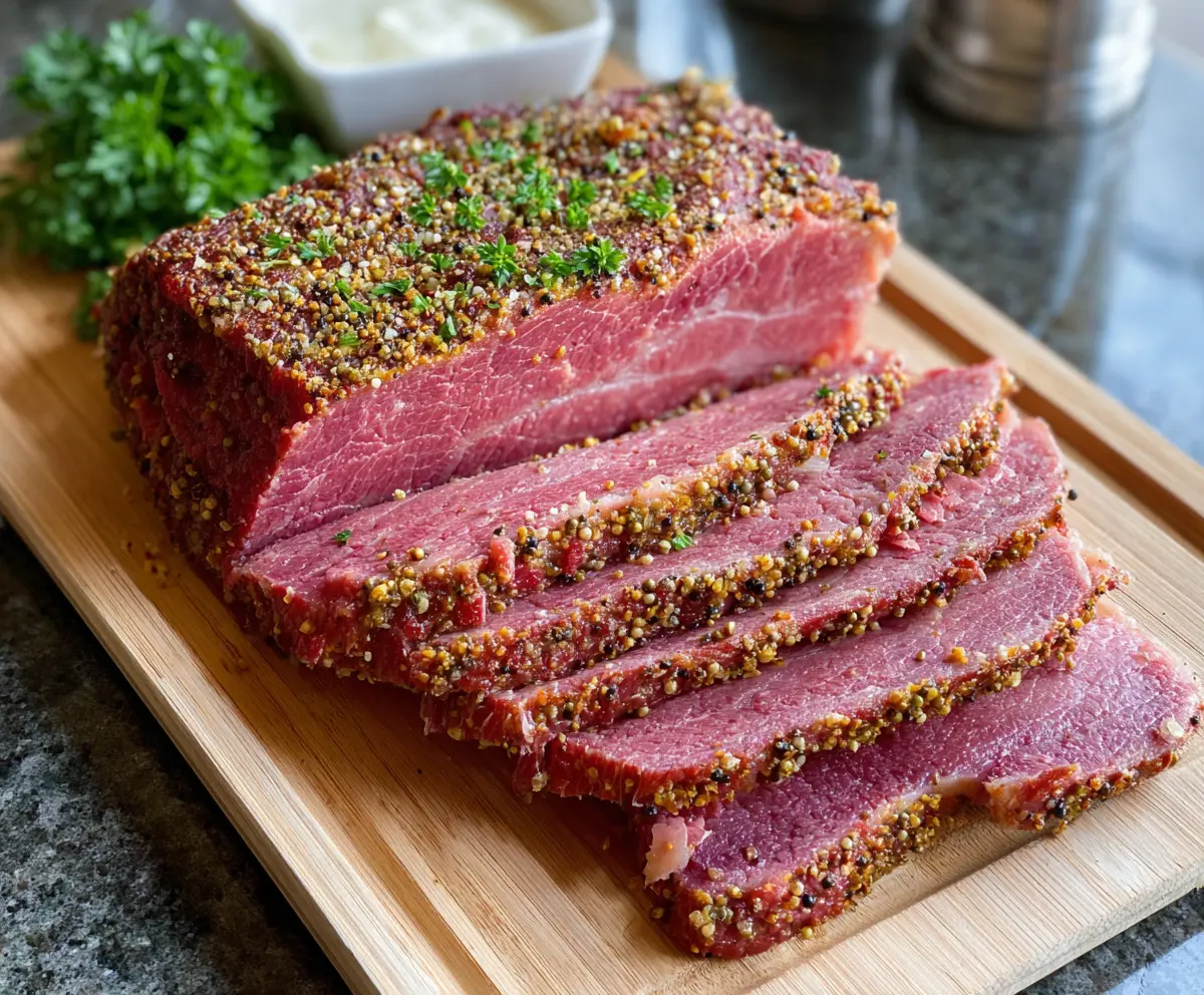 Enjoy your flavorful Oven Roasted Corned Beef with a spicy mustard seed crust!