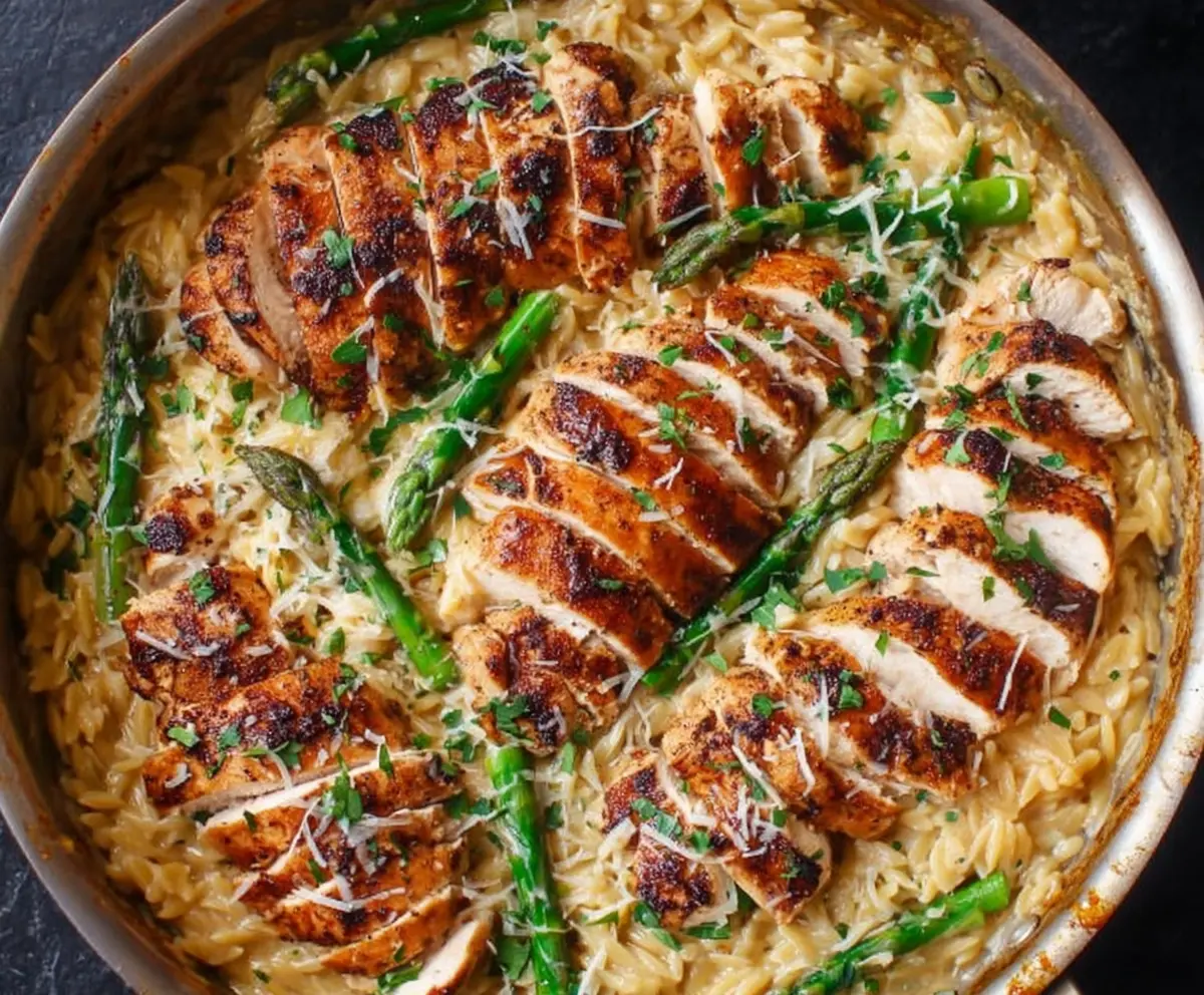 This tasty dish combines tender orzo, juicy chicken, and crisp asparagus, all mixed with creamy Parmesan cheese. It’s super comforting and packed with flavor!