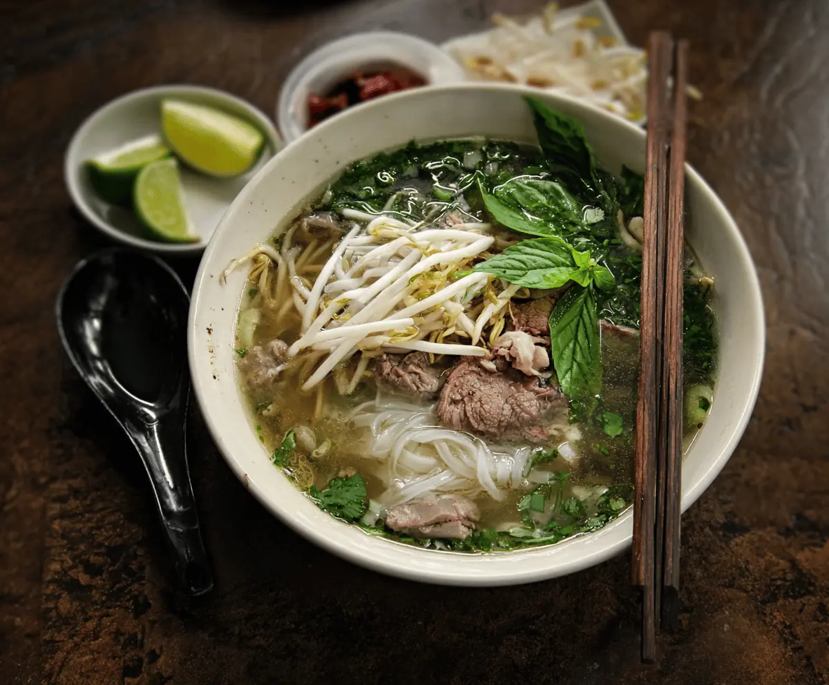 Pho is a warm and comforting Vietnamese soup made with broth, rice noodles, and your choice of meat like beef or chicken. It’s often topped with fresh herbs and lime, making it super tasty!