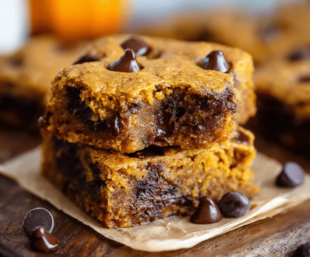 Your Pumpkin Chocolate Chip Bars are ready to be enjoyed! They are dense, chewy, and bursting with melty chocolate pockets, perfectly complemented by warm pumpkin spices. Ideal for sharing (or keeping all to yourself)!