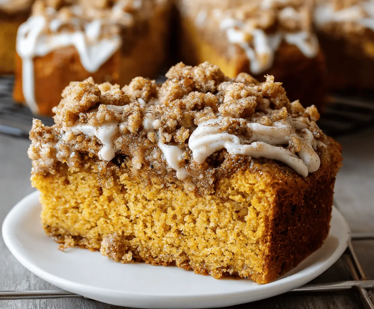 Enjoy this deliciously spiced, moist Pumpkin Coffee Cake topped with a crunchy streusel and sweet icing! Perfect for any occasion, but especially delightful during the autumn season! 🎃🍰