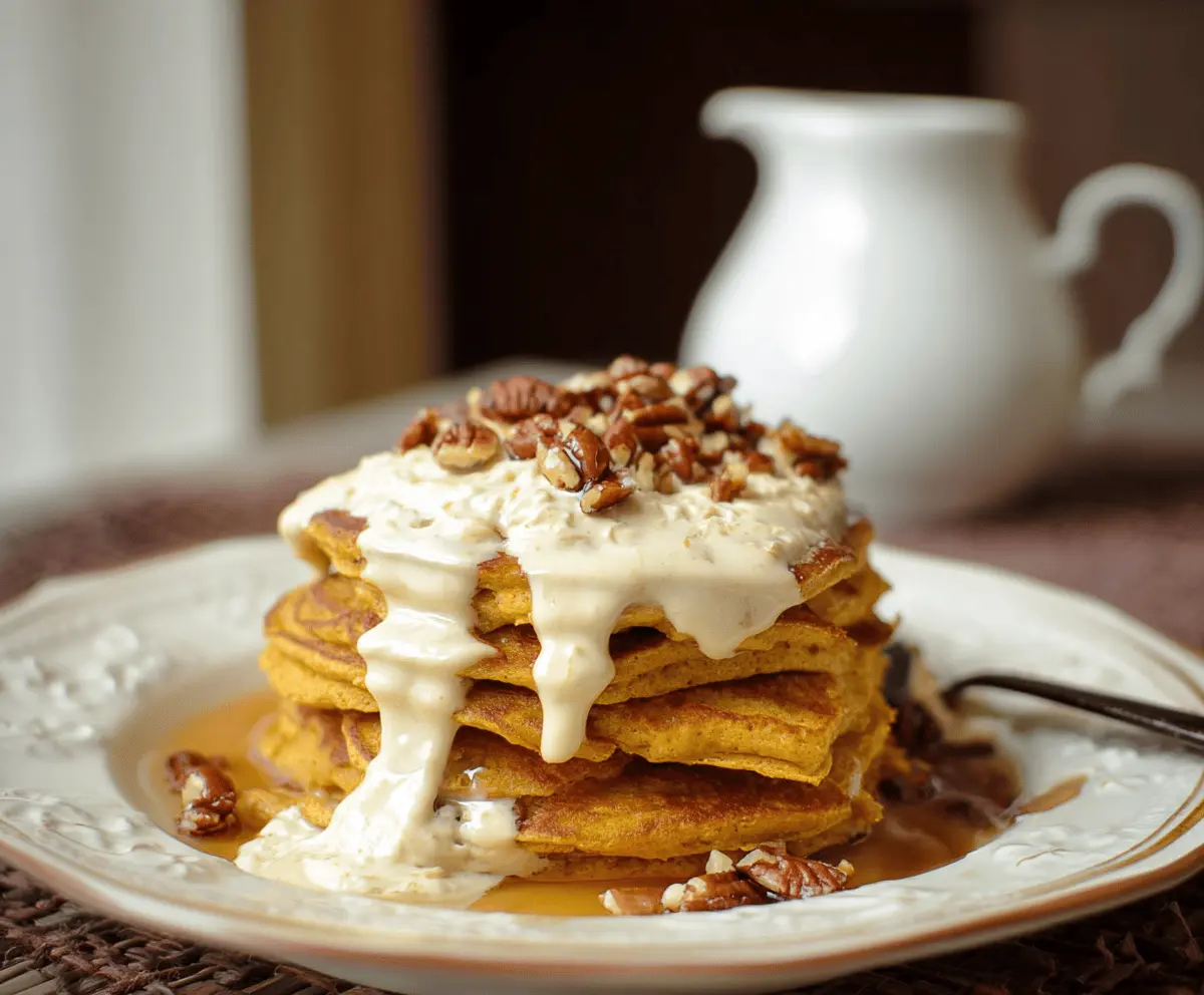 Dive into these fluffy, spiced pumpkin pancakes with the creamy topping. It’s a delightful way to start any day!