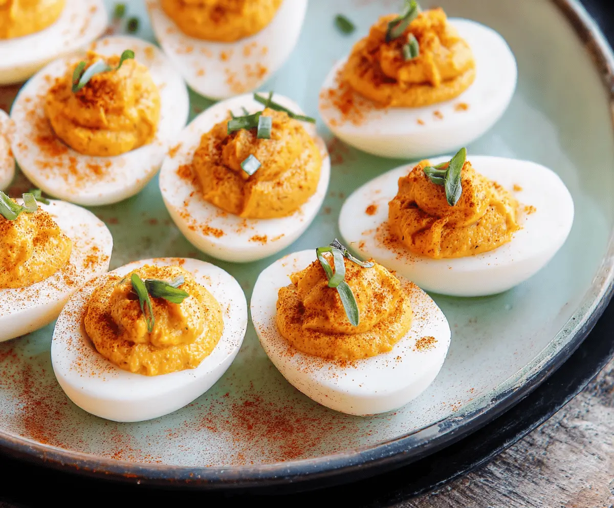 These Pumpkin Deviled Eggs are a fun twist on a classic favorite! With a creamy filling made from egg yolks mixed with pumpkin and spices, they’re both tasty and festive.
