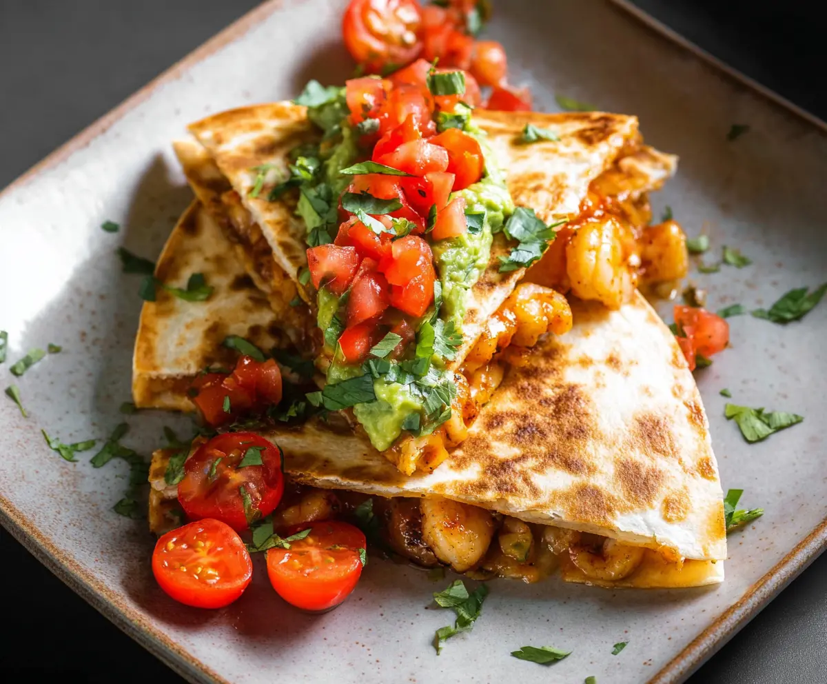 Enjoy your homemade shrimp quesadillas with their melty cheese and zesty toppings!