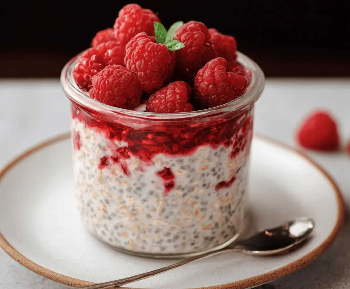 Raspberry overnight oats are a simple, tasty breakfast that makes mornings a breeze! Just mix oats, yogurt, milk, and fresh raspberries, then let them chill overnight.