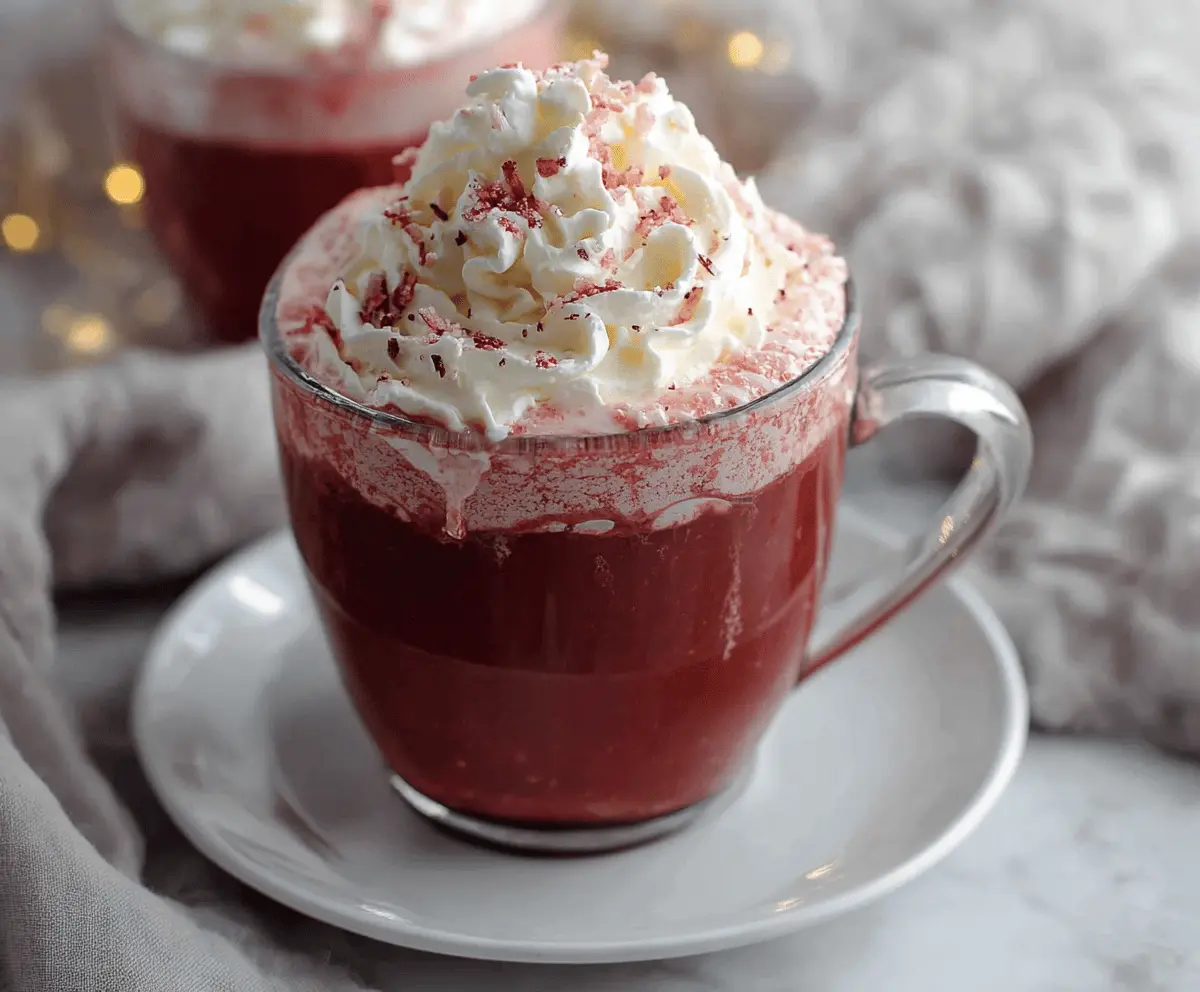 This Red Velvet Hot Chocolate is a cozy treat that brings together the rich flavor of cocoa and the sweetness of red velvet cake. Topped with fluffy whipped cream, it’s pure comfort in a cup!