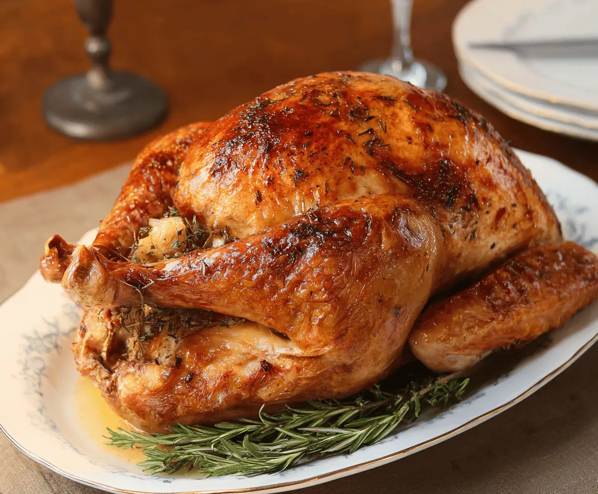 Transfer the turkey to a serving platter, garnish with fresh thyme sprigs, carve, and enjoy your beautiful roast turkey at your festive meal!