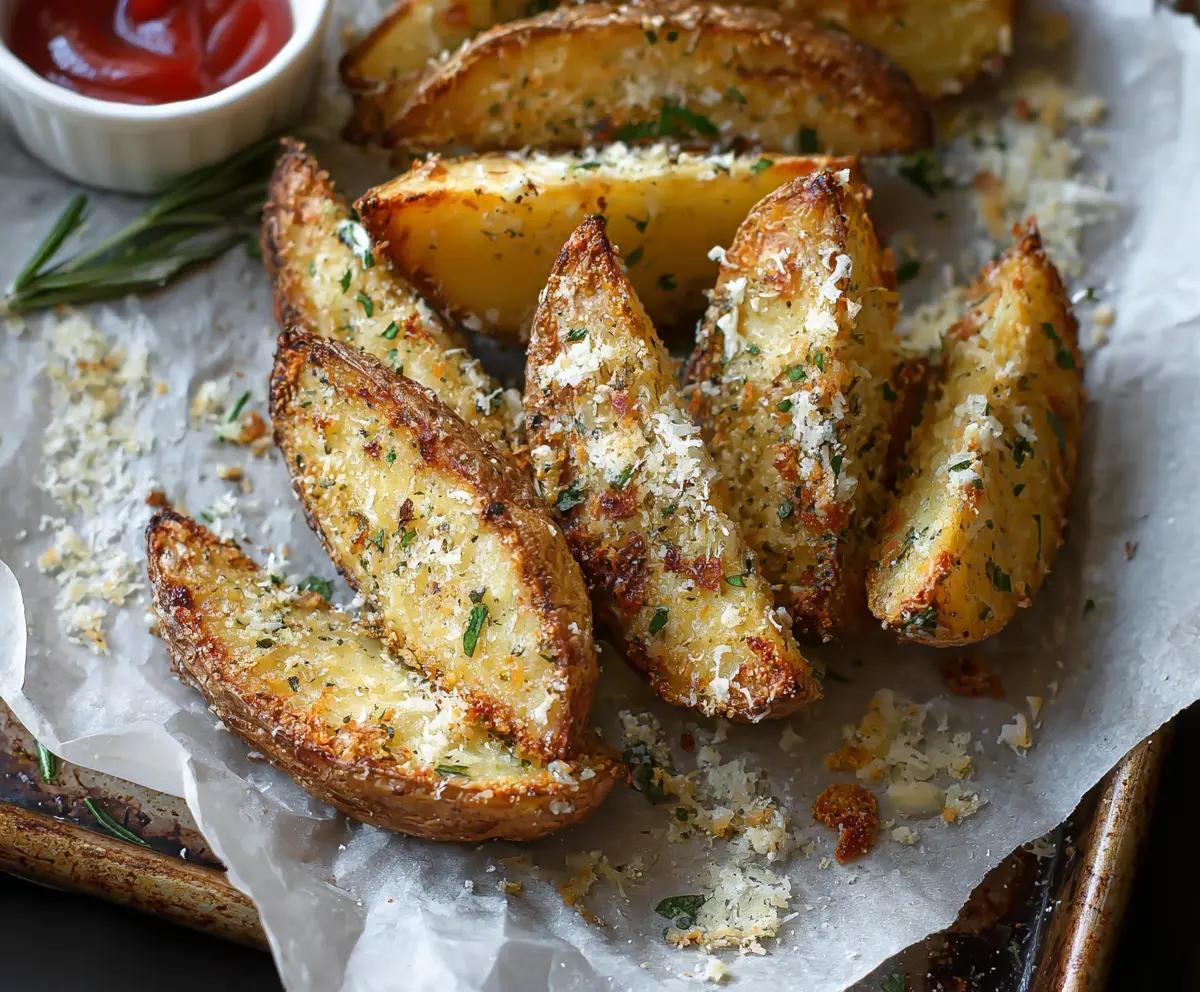 These roasted garlic parmesan potato wedges are crispy on the outside and fluffy on the inside. Tossed with garlic and parmesan, they are super tasty and perfect for snacking!