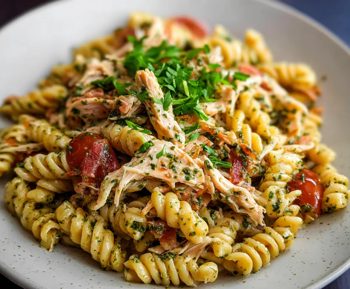 Stir in the grated Parmesan cheese until it melts and is fully combined in the dish. Finally, garnish your pasta with freshly chopped parsley for a pop of color and flavor. Serve warm and enjoy your hearty Rotisserie Chicken Pasta!