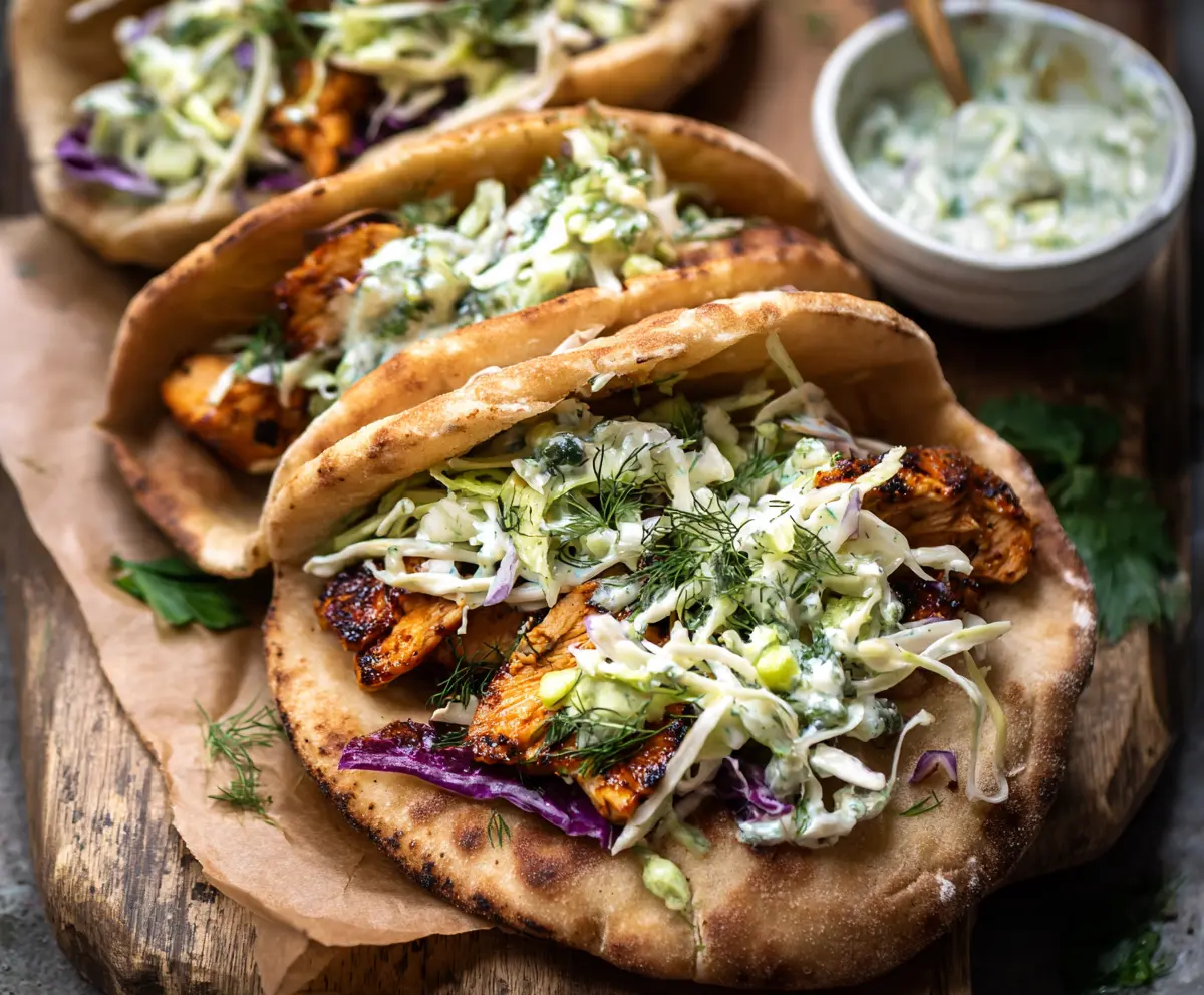 Now that everything is ready, it’s time to fill those pitas! Open each warm pita and add a generous handful of the baked chicken pieces. Top it off with a good portion of the fresh herb ranch slaw to add that crunchy, zesty touch.