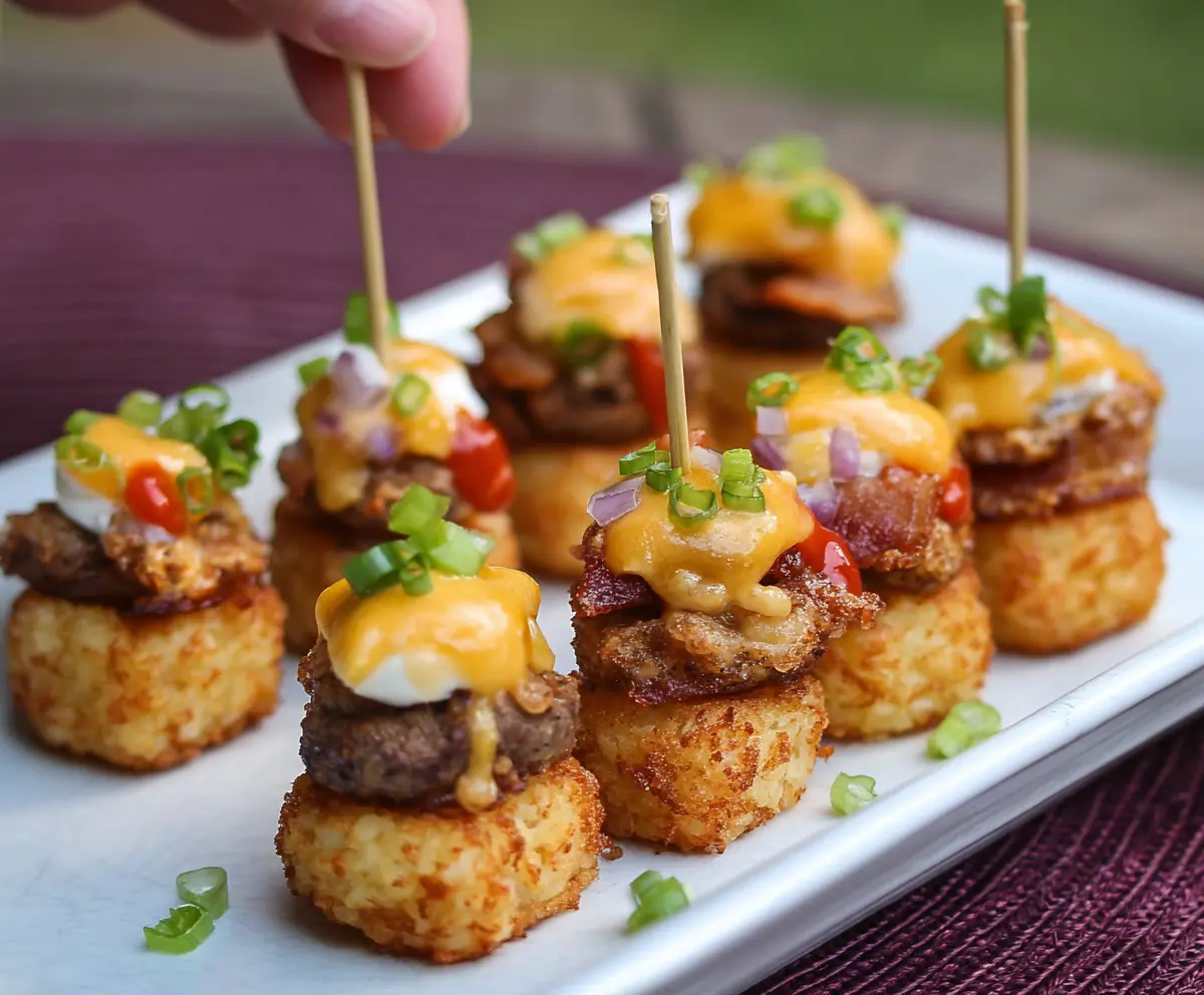 Yes! You can bake the tater tots and cook the mini patties ahead of time. Assemble the bites just before serving to ensure everything stays crispy. Store components in the fridge for up to 2 days, then reheat the patties and retouch the tater tots in the oven for a few minutes before assembly.
