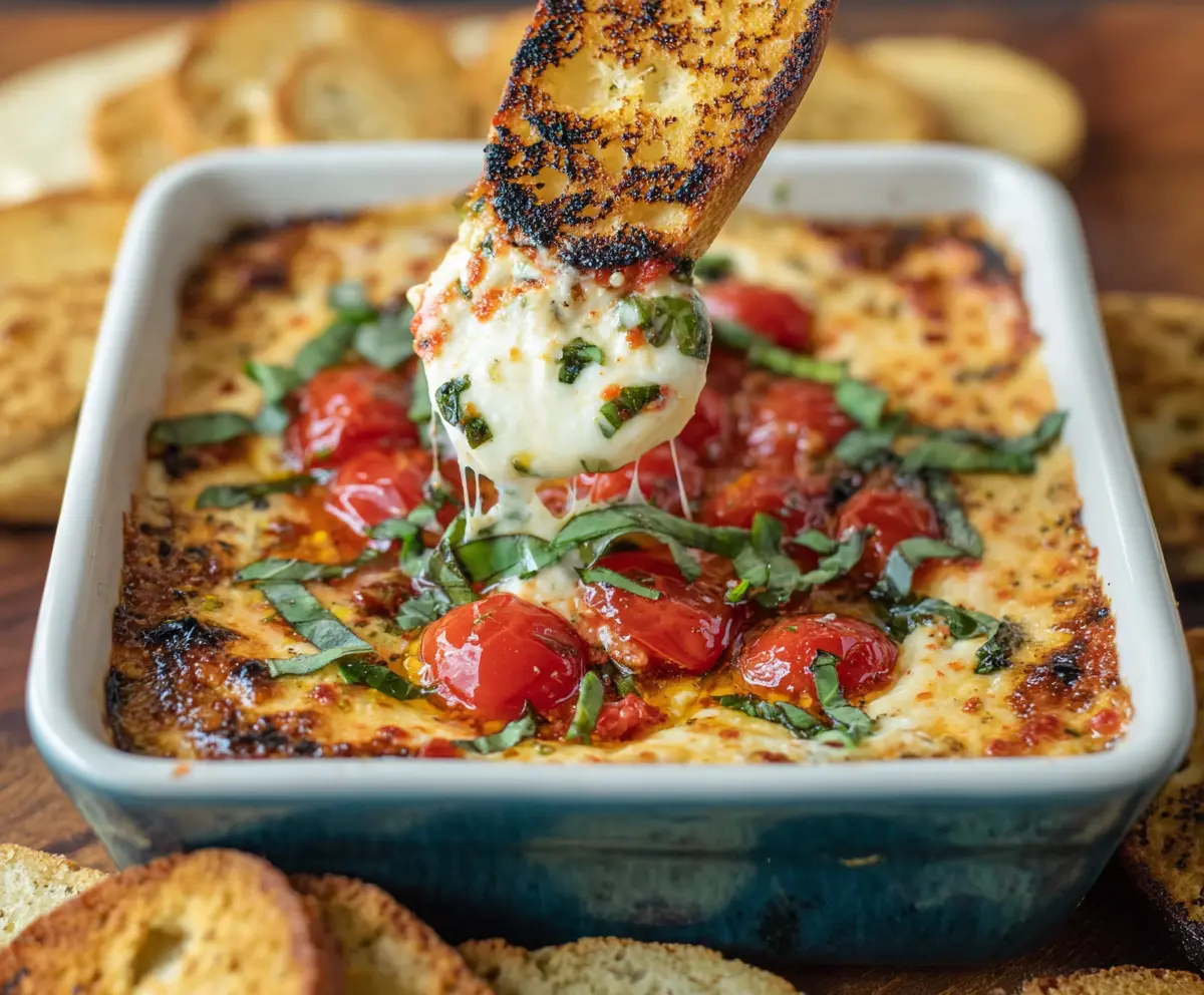 Serve the dip warm with toasted baguette slices or your choice of crackers for dipping. Enjoy each cheesy, flavorful bite bursting with fresh tomatoes and basil!